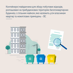Контейнерні майданчики для збору побутових відходів, розташовані на прибудинкових територіях багатоквартирних будинків, належать до елементів благоустрою (споруд), утримання яких проводиться балансоутримувачами або організаціями, визначеними ними на договірних засадах. Такі майданчики є спільним майном багатоквартирного будинку, яке належить усім власникам квартир та нежитлових приміщень у багатоквартирному будинку як співвласникам на праві спільної сумісної власності.