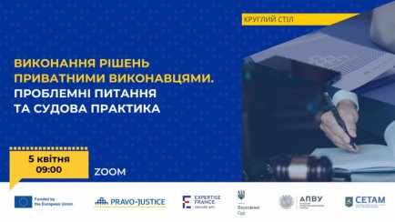 5 квітня 2024 року відбудеться круглий стіл "Виконання рішень приватними виконавцями. Проблемні питання та судова практика". Захід організовано Верховний Суд спільно з Асоціація приватних виконавців України та OpenMarket - СЕТАМ за підтримки Проєкту ЄС "Право-Justice".