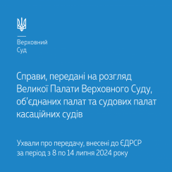Цього тижня інформуємо вас про перелік справ, переданих на розгляд Великої Палати Верховного Суду, об’єднаних палат і судових палат касаційних судів відповідно до ухвал про передачу, внесених до ЄДРСР з 8 по 14 липня 2024 року.