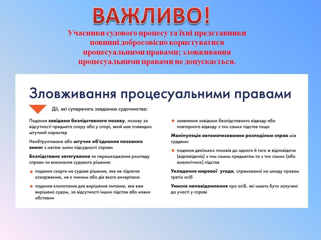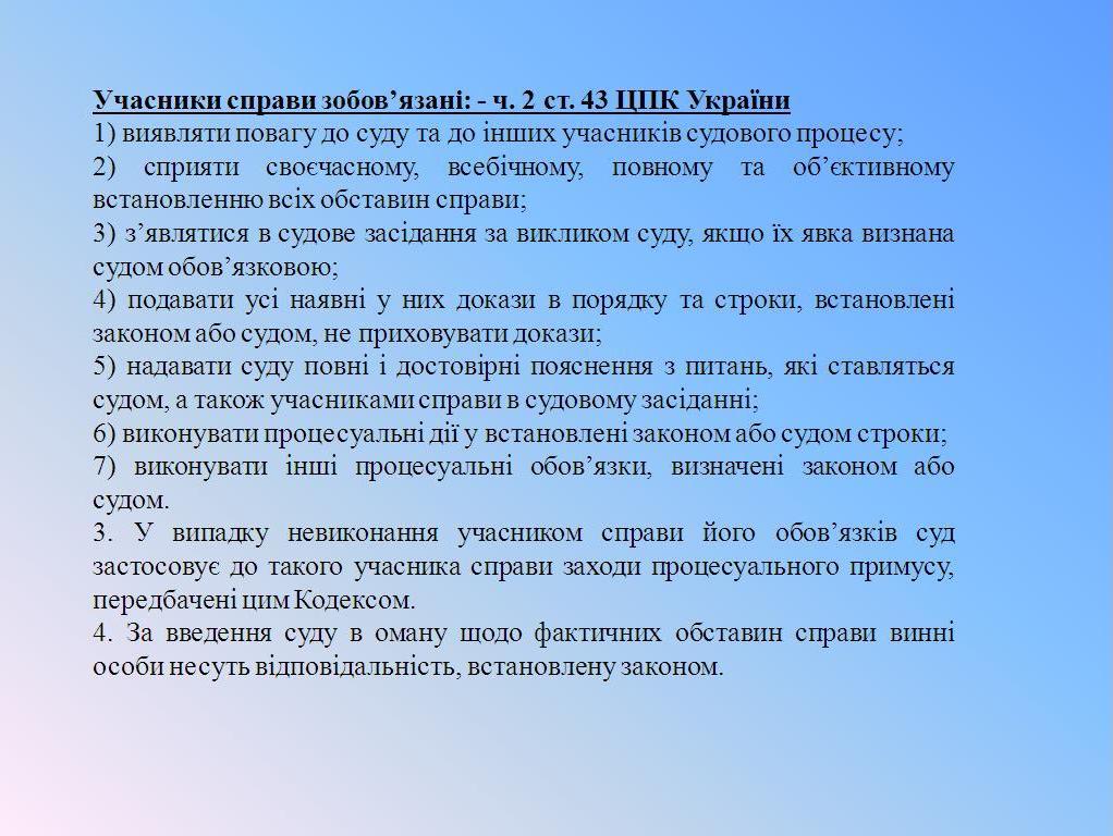 Придніпровський районний суд м. Черкас оприлюднив інформацію про процесуальні права та обов'язки учасників справи, та їх представників