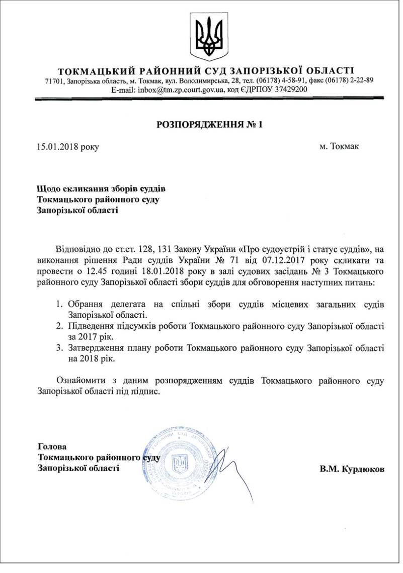 У Токмацькому райсуді Запорізької області відбудуться збори суддів